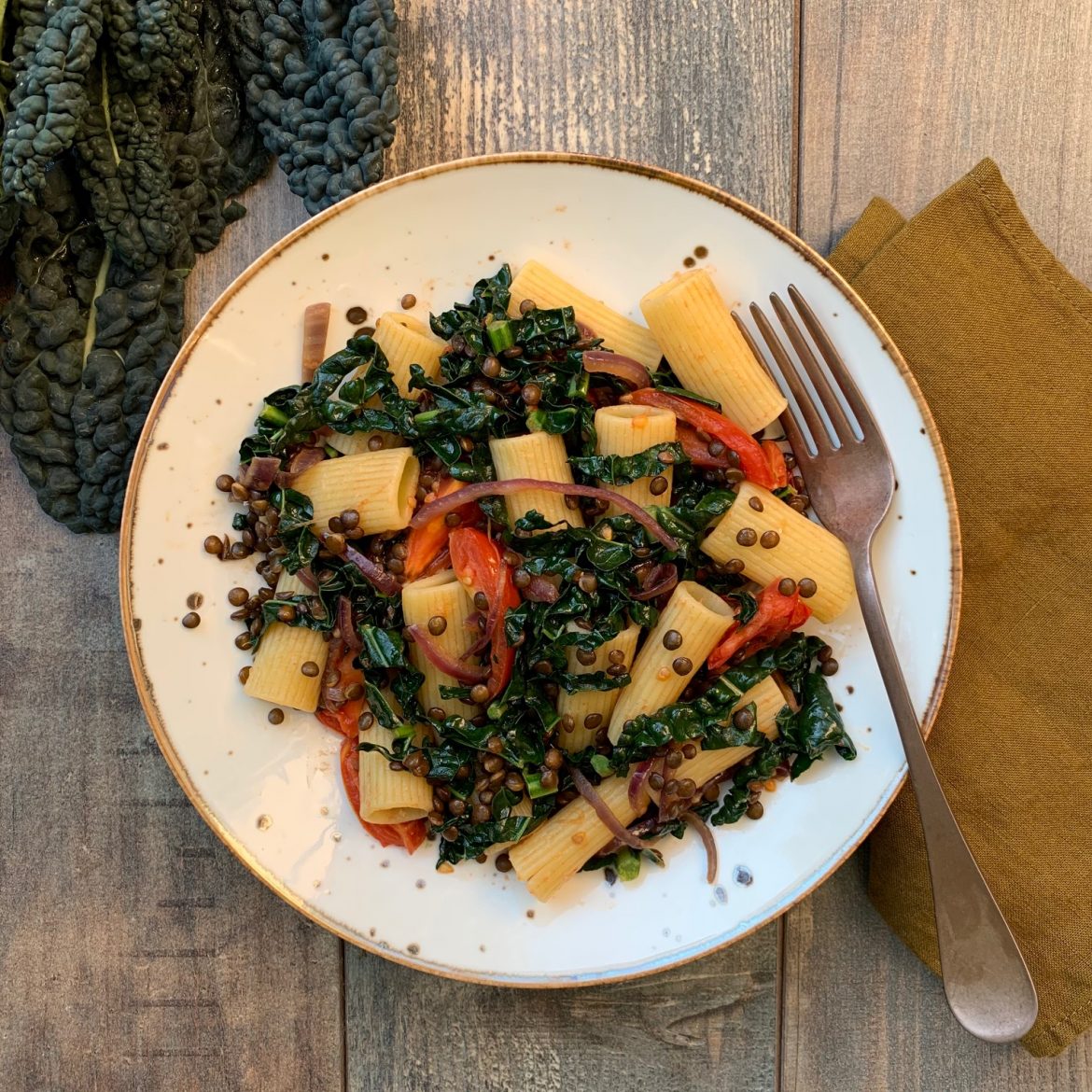 La pasta con lenticchie e cavolo nero è una ricetta invernale per un primo piatto ricco, sano, nutriente e veramente gustoso. Il cavolo nero è un ortaggio dal basso contenuto calorico, ricco di minerali e vitamine, molte delle quali dotate di proprietà antiossidanti. E’ uno dei vegetali invernali più sani, ma purtroppo non è molto presente nella nostra cucina. Se vi piacciono i sapori più decisi e orientali, potete condire le lenticchie con curcuma, cannella e peperoncino. Guardate anche la ricetta per Insalata di lenticchie e pomodori secchi e Vellutata di carote e lenticchie rosse