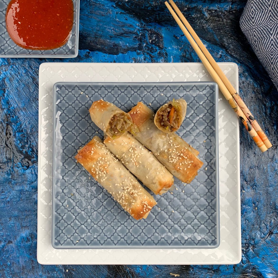 Involtini primavera di pasta fillo con manzo e scarola cotti al forno. Leggeri, saporiti, croccanti e molto gustosi. Potete servirli come antipasto oppure come piatto unico accompagnato da una salsa agrodolce (la ricetta è qui). La presenza della scarola aggiunge un po’ di dolcezza e delicatezza al piatto e li rende ancora più salutari. Guardate anche la ricetta per Involtini primavera con pollo e Triangolini di pasta fillo con verdure.