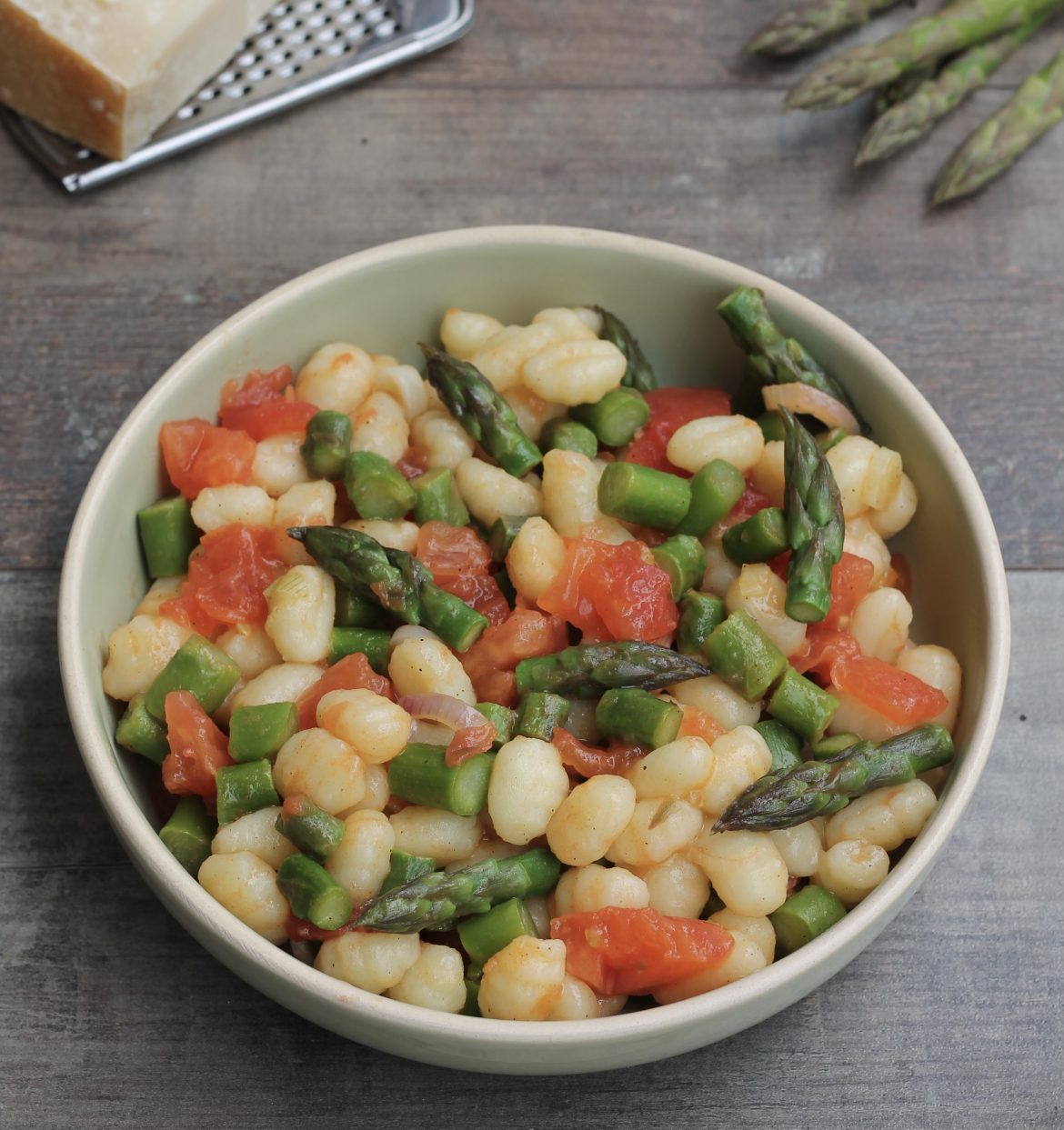 Gli gnocchetti con asparagi e pomodori sono un primo piatto primaverile semplice da preparare, delicato e davvero molto gustoso, condito con il sale affumicato che dà un tocco in più a questo buonissimo piatto. Potete sostituire gli gnocchi con la pasta integrale e finire la preparazione con una spolverata di parmigiano.