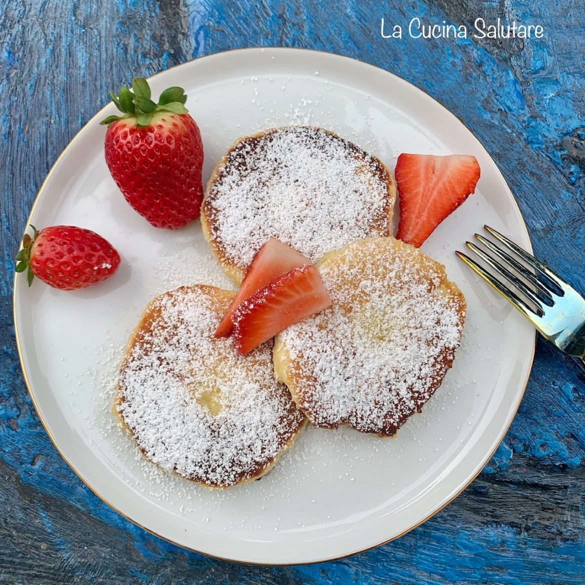 La mia versione degli Syrniki fit ucraini, ovvero pancakes fit al formaggio. Molto gustosi, leggeri e poco dolci, che potete servire con miele, confetture, yogurt e frutta, oppure cosparsi con lo zucchero (o l’eritritolo) a velo. La ricetta originale prevede la frittura, ma vi suggerisco di prepararli al forno oppure con la friggitrice ad aria.