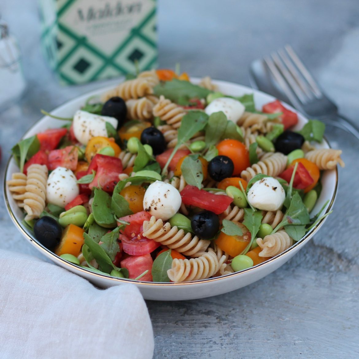 Cuocete la pasta al dente, scolatela e passatela sotto l’acqua fredda per fermare la cottura. Versatela in una ciotola e unite la soia, il pomodoro tagliato a pezzetti, i datterini tagliati a metà, mozzarelline, olive e rucola. Mescolate il tutto e alla fine condite la pasta con l’olio, il sale Maldon e il pepe di Sichuan.