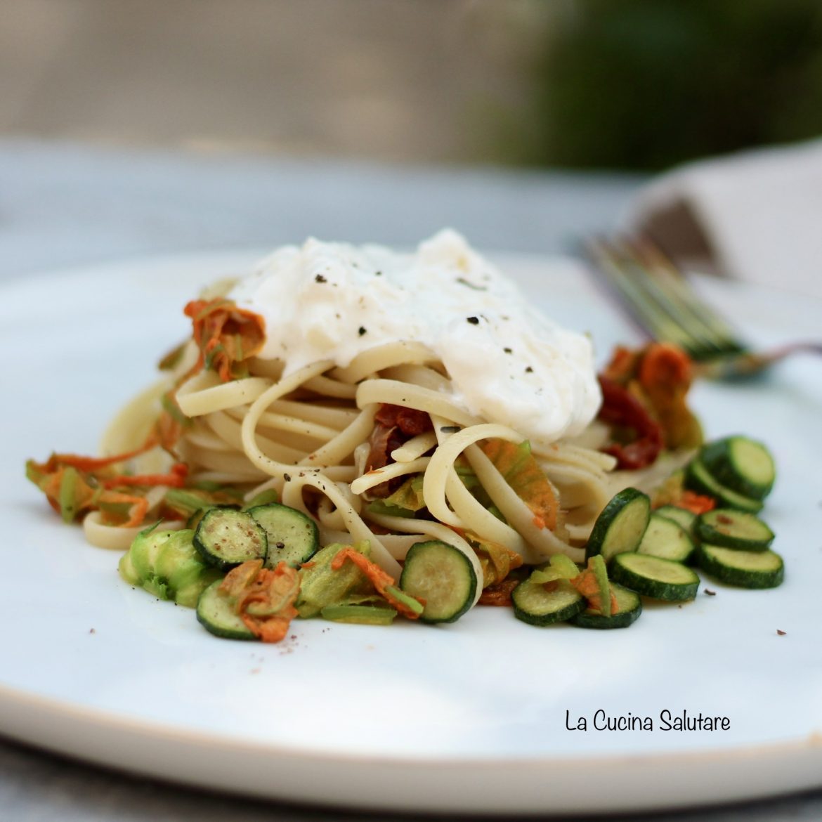 Pasta con zucchine, fiori di zucca, pomodori secchi, olive taggiasche e stracciatella. È un primo piatto davvero gustoso, saporito e profumato. Facile e veloce nelle preparazioni, è perfetto per il pranzo estivo.