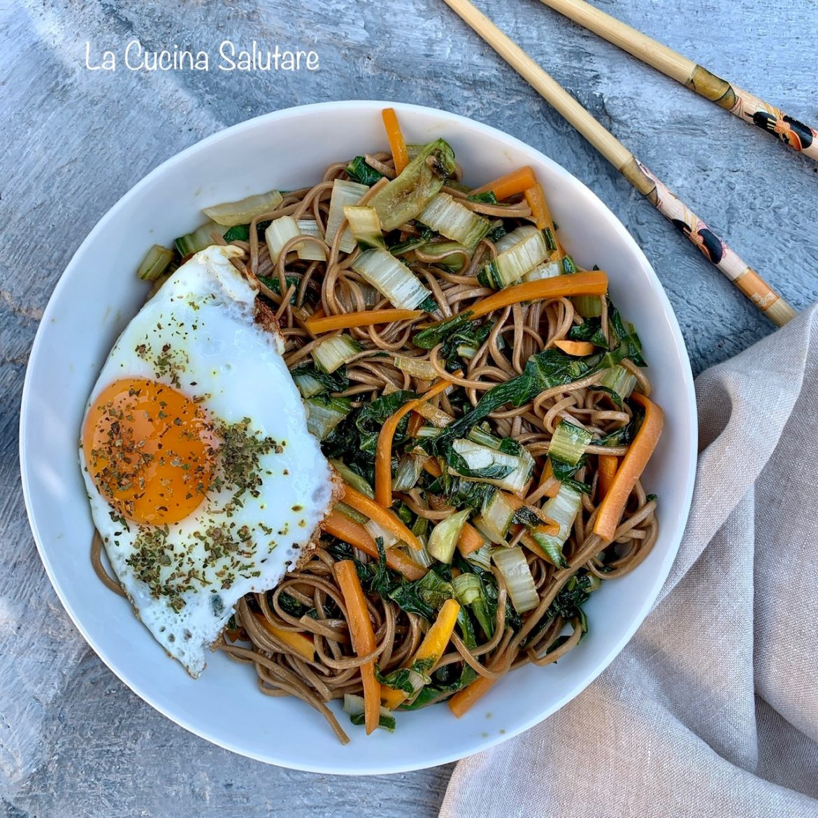 Pasta con verdure e uovo all’occhio di bue. Un piatto #zerosprechi o cosiddetto #svuotafrigo che ho preparato in meno di 15 minuti. Ho utilizzato la pasta soba perché ha il tempo di cottura solo di 3 minuti. Le verdure le potete scegliere liberamente secondo il contenuto del vostro frigo e l’uovo sostituirlo con il #tofu come alternativa vegana