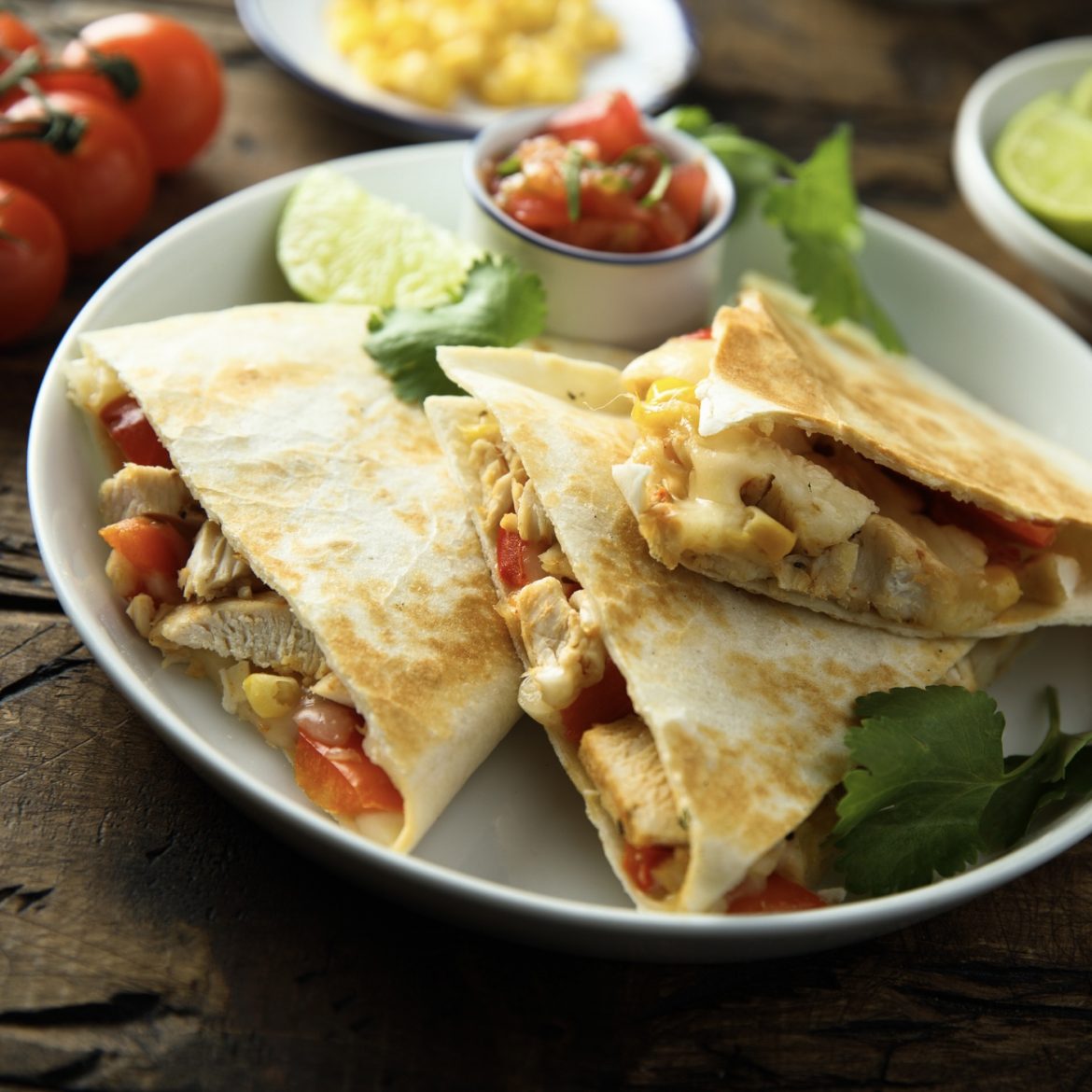 Le quesadillas sono un classico piatto messicano. Sono tortillas ripiene di carne o di verdure e di formaggio, cotte lentamente in padella finché il formaggio non si scioglie, gli ingredienti del ripieno sono caldi e le tortillas sono dorate e croccanti. La quesadilla con pollo e verdure è un’idea sfiziosa per un pranzo o una cena in famiglia o con gli amici. Perfetta per porzionare, ricca di pollo aromatico e verdure succose. E’ ottima con salsa allo yogurt e aglio (la ricetta è qui), salsa di pomodoro o guacamole. Le tortillas le potete trovare nei supermercati o preparale in casa, la ricetta è qui.