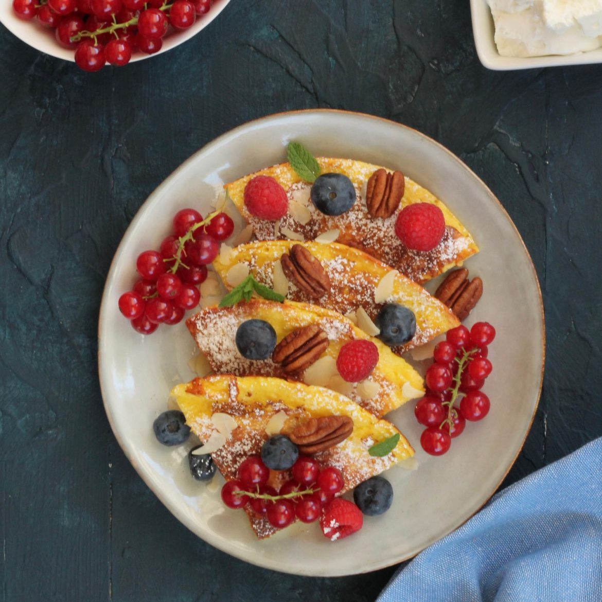 Mettete tutti gli ingredienti in un contenitore e mescolate bene con una frusta. Riscaldate una padella antiadarente (mi raccomando, di ottima qualità, che non richiede l’utilizzo di grassi) e versate il composto. Cuocete la omelette su fuoco basso su entrambi i lati. Una volta pronta, conspargete con lo zucchero e servite con la frutta fresca e le noci.