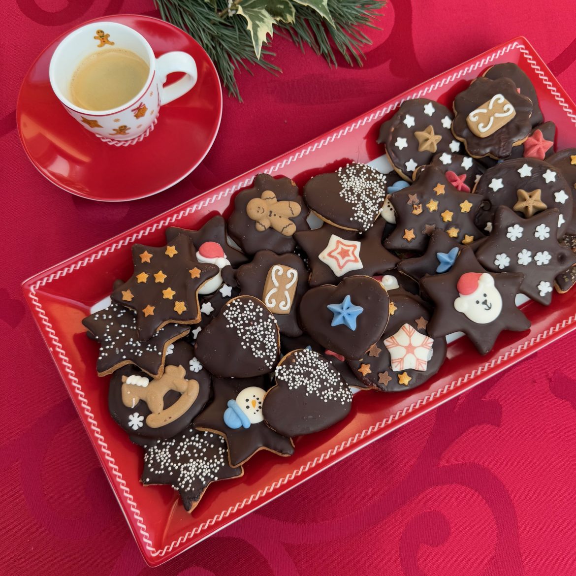 Settacciate la farina, aggiungete il burro freddo e tritate velocemente con un coltello. Aggiungete gli altri ingredienti e impastate velocemente (l'impasto si può lavorare anche in planetaria). Formate una palla con l'impasto, avvolgetela nella pellicola e fatela riposare in frigorifero per almeno un'ora. Togliete l'impasto freddo dal frigo e stendetelo ad uno spessore di circa 4 mm. Ritaglaite i biscotti, disponeteli su una teglia rivestita di carta di forno e cuocete i biscotti a 200 gradi per circa 12 minuti. Lasciate raffredare. Decorate con il cioccolato sciolto a bagnomaria, decorazioni in zucchero, frutta secca, ecc.