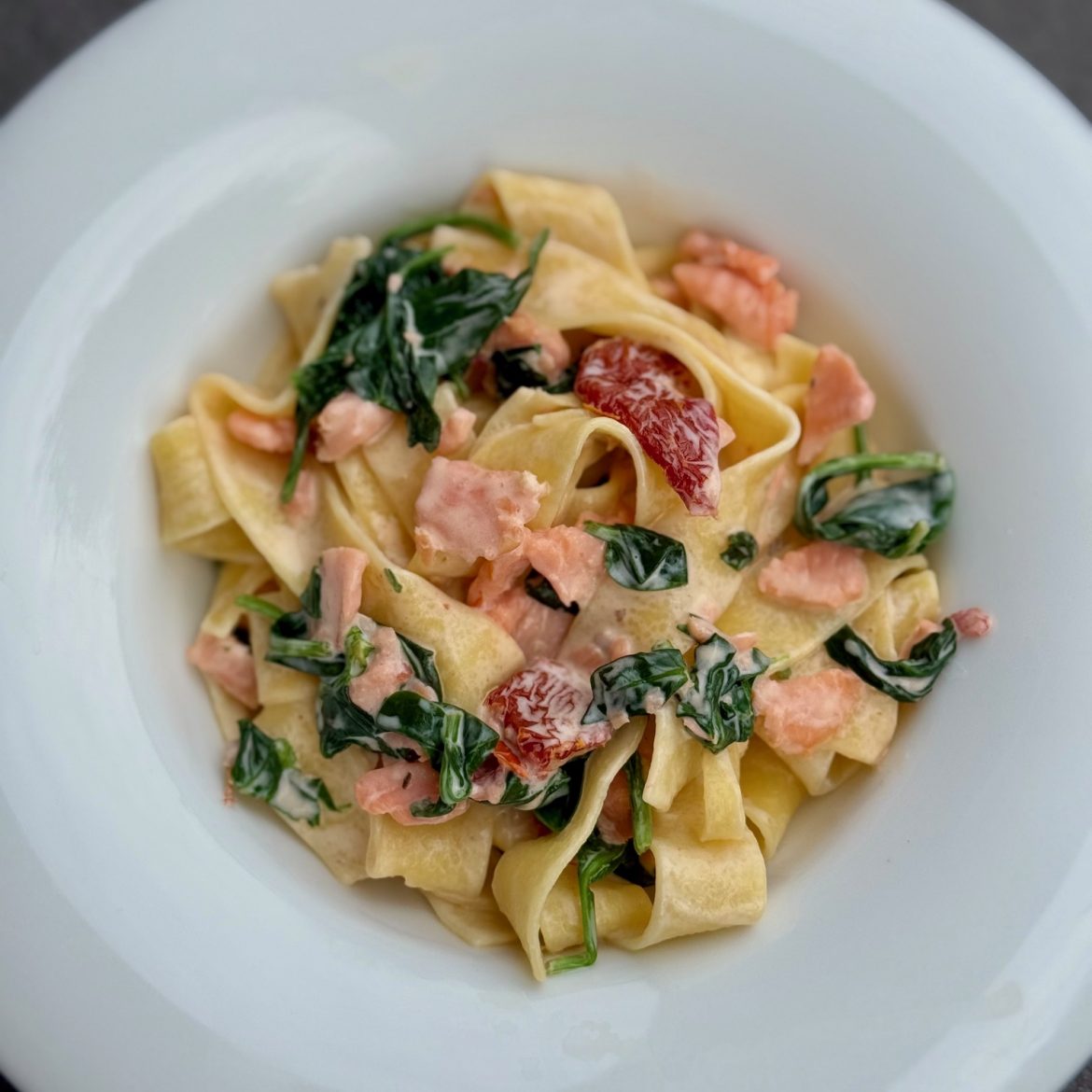 Qualcuno ha detto #venerdipesce ?Allora presente all’appello con un piatto di pasta super veloce e facile da preparare. In pochi minuti avete pronto un piatto gustoso e nutriente. Pasta (qui pappardelle) con salmone affumicato, pomodori secchi e spinaci. Ho aggiunto qualche cucchiaio di formaggio spalmabile (avevo a casa solo il Philadelphia light), ma potete aggiungere anche la ricotta.