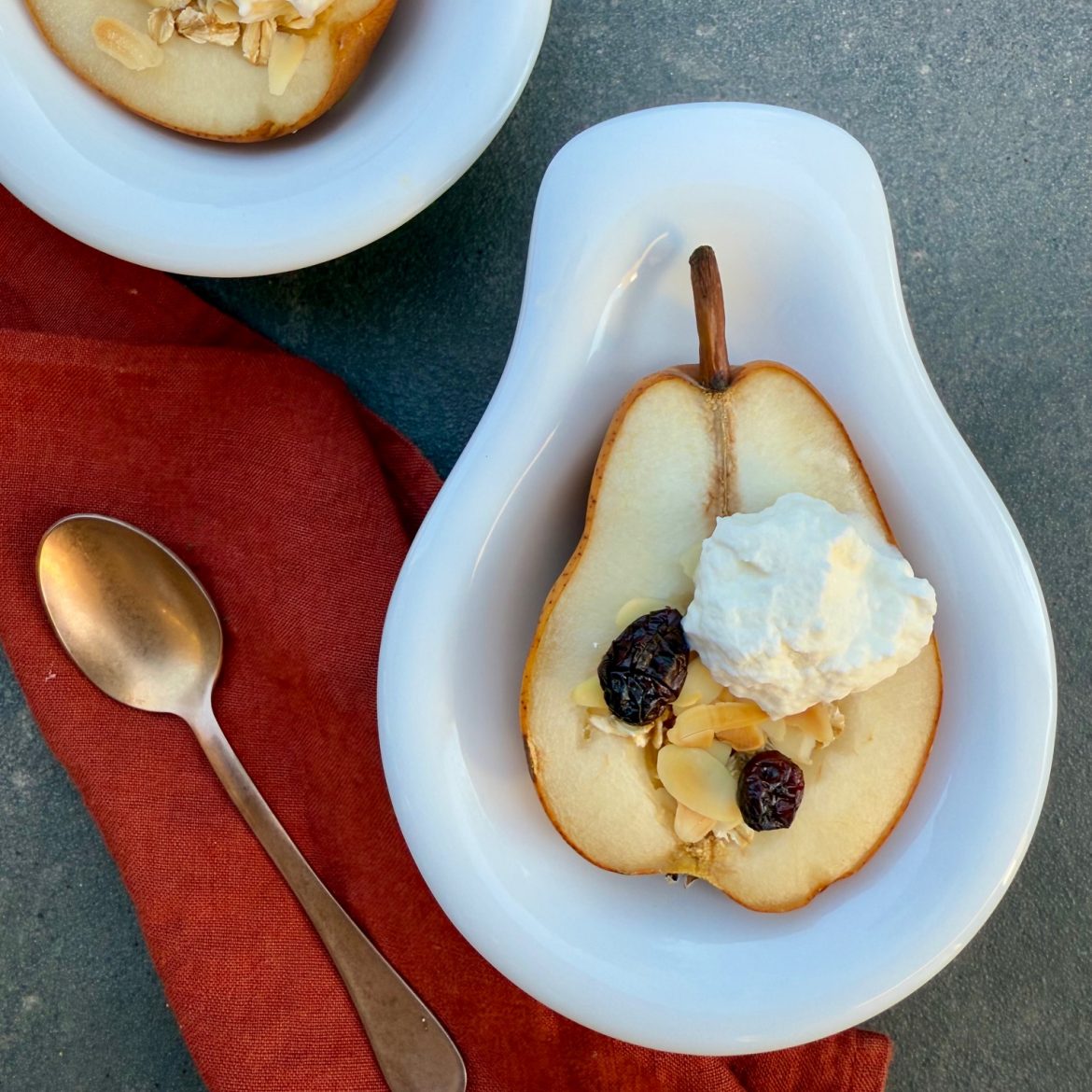 Pera cotta al forno con frutta secca e servita con la panna di cocco. Un dolce goloso e leggero per fine pasto oppure per una merenda sana. La panna di cocco la potete sostituire con il vostro yogurt preferito.