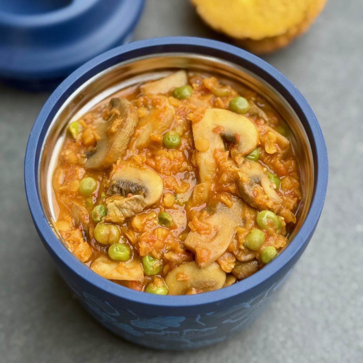Curry di lenticchie con funghi champignon. Un piatto saziante e nutriente, perfetto non solo per il vostro pranzo al lavoro, ma anche per una cena confortevole a casa. Da mangiare caldo, quindi se non potete scaldarlo, portatelo con voi in un thermos, come ho fatto io. Potete servirlo con riso o con pane.