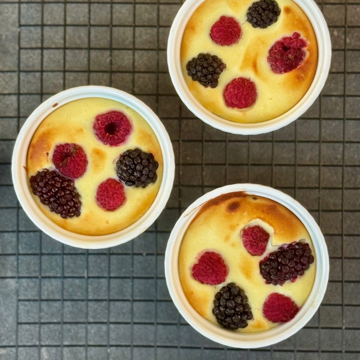 Unite tutti gli ingredienti, versate l’impasto nei pirottini in ceramica e ponete sopra la vostra frutta preferita (ho utilizzato i frutti di bosco congelati).🫐🍓
