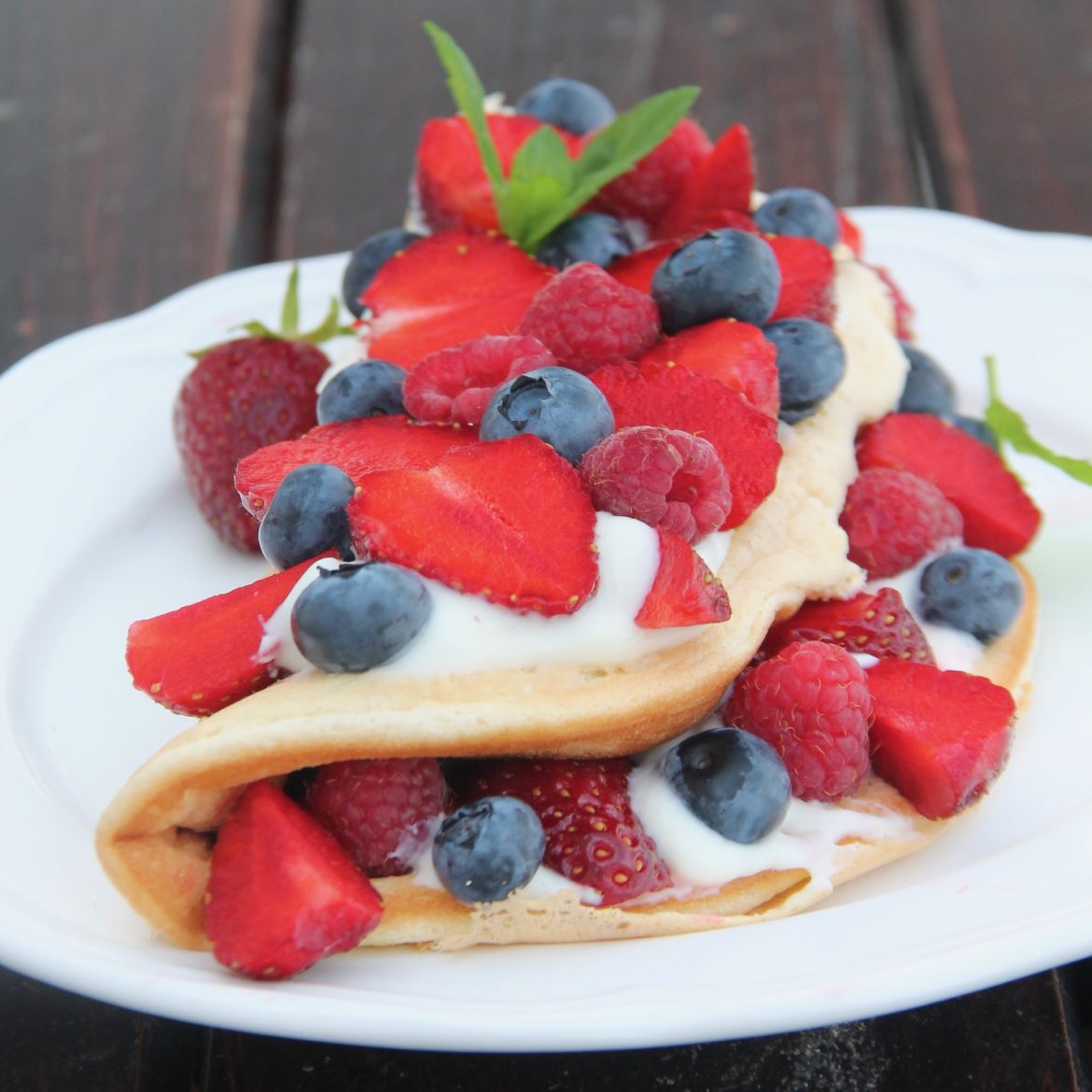 Separate i tuorli dagli albumi e montate questi ultimi a neve. Aggiungete lo zucchero e i tuorli continuando a montare a velocità più bassa. Quindi aggiungete la farina e mescolate delicatamente con una frusta o con una forchetta. Riscaldate bene la padella antiaderente su fuoco medio. Versate il vostro impasto e distribuite su tutta la superficie della padella, quindi cuocete il pancake su ambo i lati. Quando è pronto, mettete lo yogurt e posate la frutta.