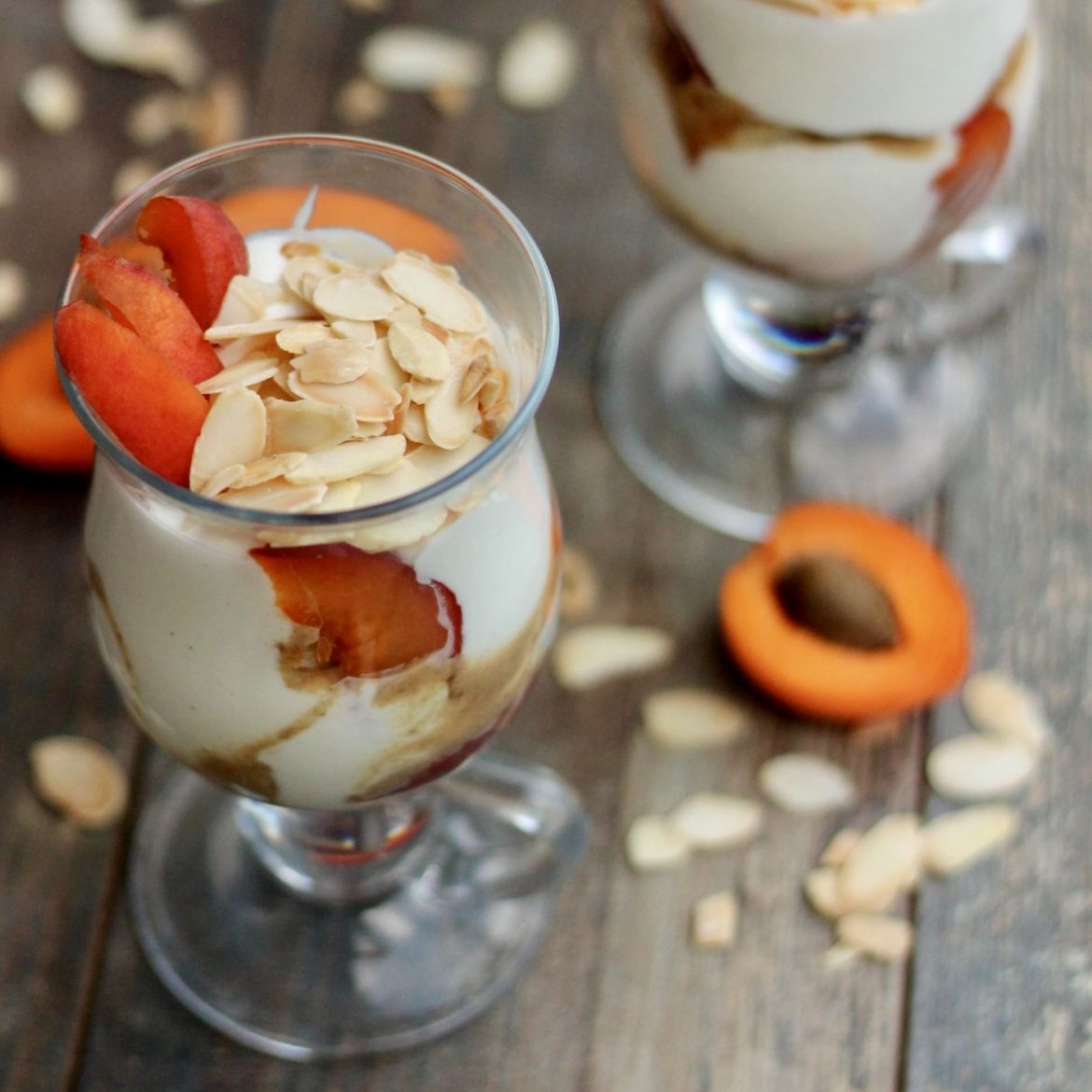 Inzuppate i savoiardi tagliati in tre nel caramello salato preparato per 30 secondi e mettetene qualche pezzo sul fondo dei bicchieri. Versate due cucchiai di Skyr e ricotta, posate qualche pezzettino di albicocche e ripetete ancora con il resto dei savoiardi, il resto dello Skyr e della frutta. Alla fine cospargete il dessert con le mandorle tostate. Lasciate i dolci nel frigo per un'ora.