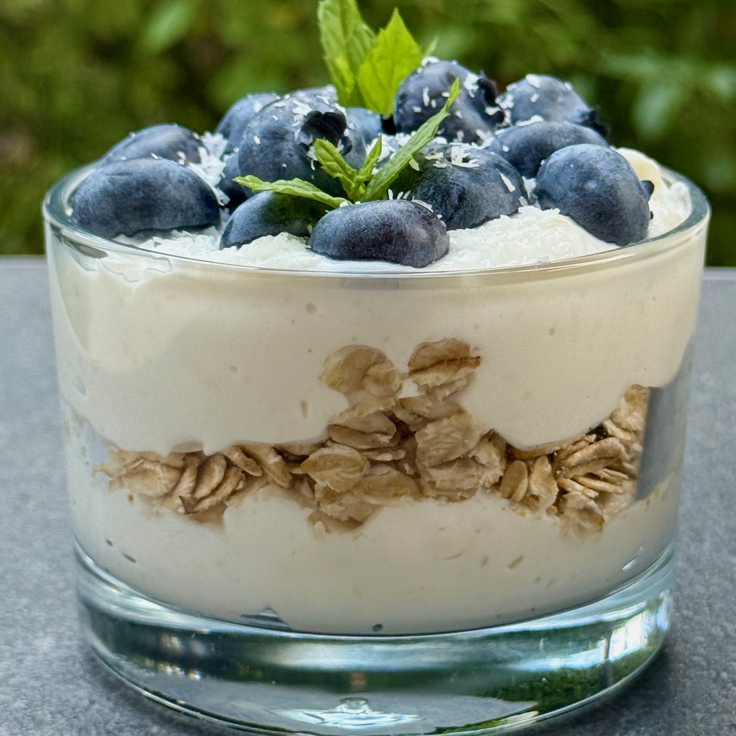 Mescolate lo yogurt magro con la crema al cocco e mettete la metà nel bicchiere. Versate i fiocchi di avena e poi il resto dello yogurt. Decorate con i mirtilli e cospargete il tutto con il cocco rapè.